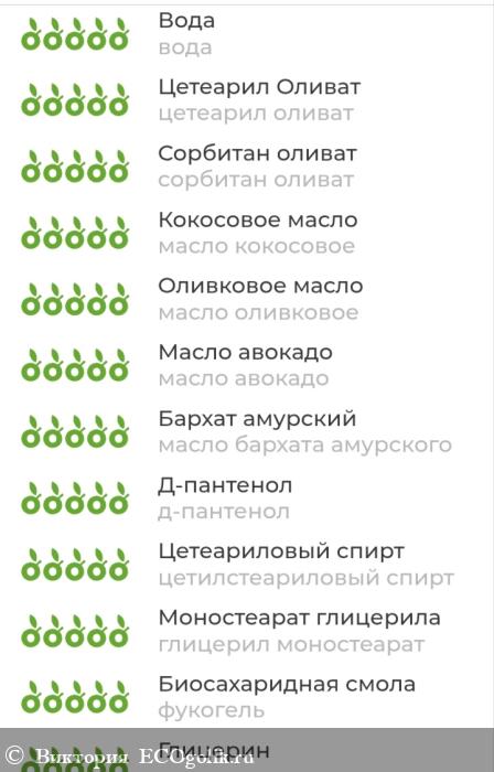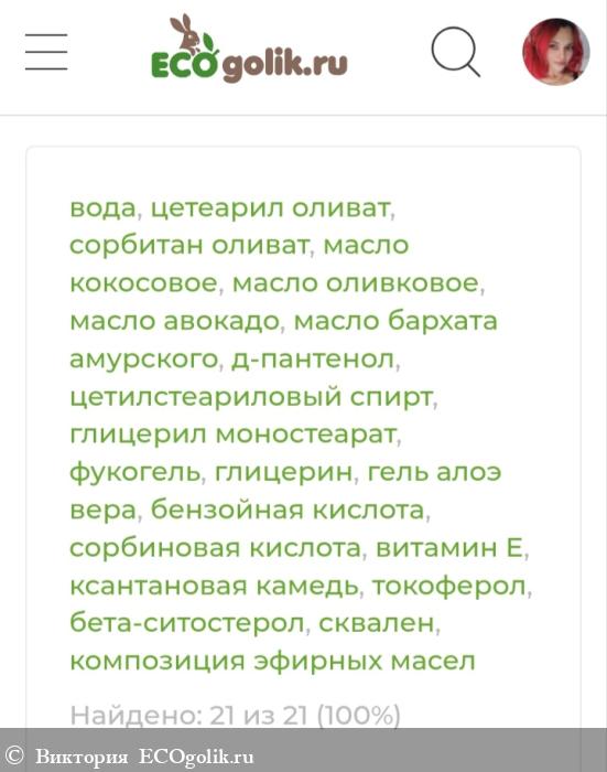 вода, цетеарил оливат, сорбитан оливат, триглицериды, масло кокосовое, масло оливковое, масло авокадо, масло бархата амурского, д-пантенол, Hydroxyethylurea гидроксиэтил мочевина, цетилстеариловый спирт, глицерил моностеарат, фукогель, глицерин, гель алоэ вера, бензиловый спирт, бензойная кислота, сорбиновая кислота, витамин Е, ксантановая камедь, токоферол, бета-ситостерол, сквален, композиция эфирных масел.