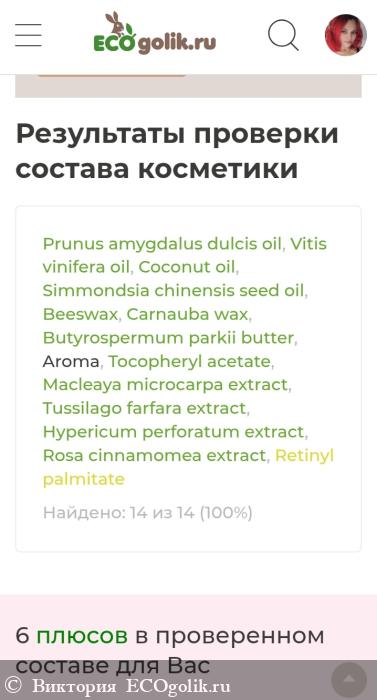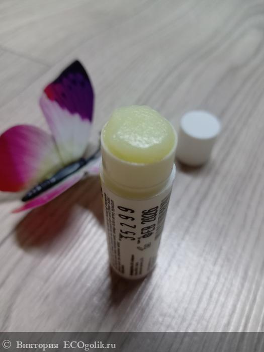Prunus amygdalus dulcis (sweet almond) oil (масло миндаля), Vitis vinifera oil (масло виноградной косточки), Coconut oil (масло кокосовое), Simmondsia chinensis (Jojoba) seed oil (масло жожоба), Beeswax (воск пчелиный), Carnauba wax (воск карнаубский), Butyrospermum parkii (Shea) butter (масло ши), Aroma (пищевой ароматизатор «Манго»), Tocopheryl acetate (витамин Е), Macleaya microcarpa extract (экстракт маклейи), Tussilago farfara extract (экстракт мать-и-мачехи), Hypericum perforatum extract (экстракт зверобоя), Rosa cinnamomea extract (экстракт шиповника), Retinyl palmitate (витамин А).