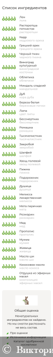 Экстракты деревьев: кора березы, кора дуба, березовые почки, хвоя кедра, побеги ели, цвет липы, хвоя пихты, лист березы.