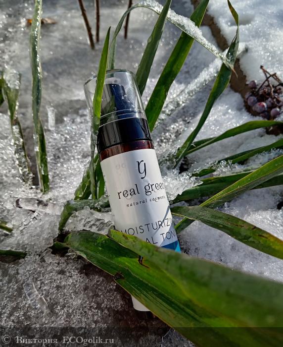 На передней части флакона размещена белая наклейка с черным текстом, что создает чистый и лаконичный образ. Название бренда Real Green выполнено в стильном шрифте, а под ним большими буквами написано MOISTURIZING FACIAL TONIC, что сразу информирует о назначении продукта.