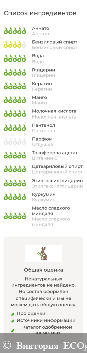 Вода, цетеариловый спирт, масло сладкого миндаля, кондиционирующий агент из рапсового масла, глицерин, кератин, пантенол, масло-баттер, манго, экстракт манго, масло соевое, молочная кислота, каприлиловый эфир или «зеленый силикон» / агент, облегчающий расчесывание, высокоомолекулярные катионные кондиционирующие добавки, целлюлозный загуститель, витамин Е, отдушка, этилгексилглицерин, бензиловый спирт, натуральные красители, куркумин и аннато.