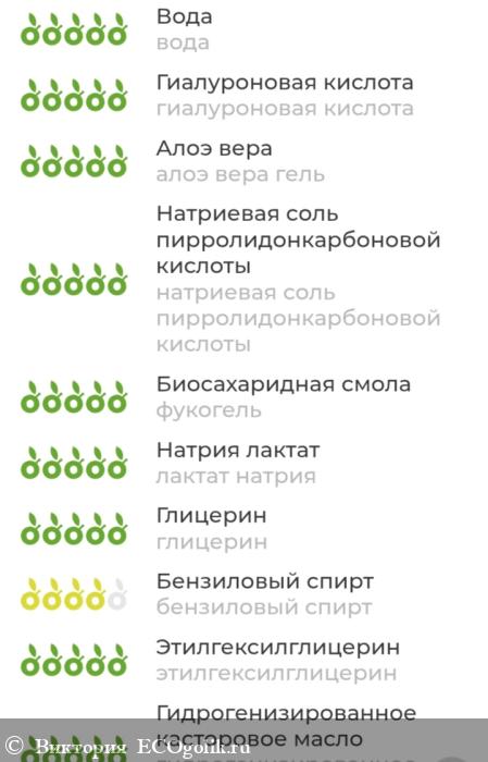 вода, гиалуроновая кислота, 1,2-гександиол, каприлил гликоль, алоэ вера гель, натриевая соль пирролидонкарбоновой кислоты, пентиленкликоль, фукогель, лактат натрия, глицерин, бензиловый спирт, этилгексилглицерин, гидрогенизированное касторовое масло, экстракт бархата, композиция эфирных масел (розмарин, лимон, герань, можжевельник, гвоздика)