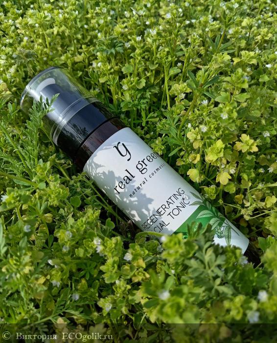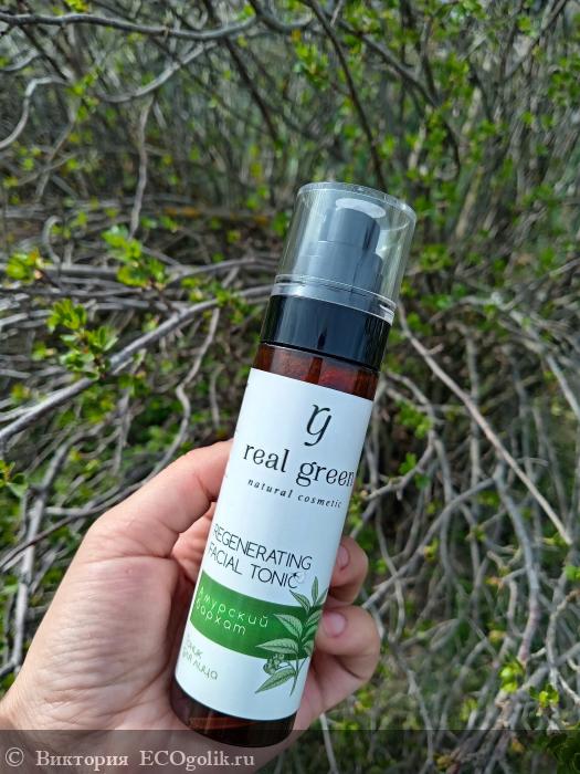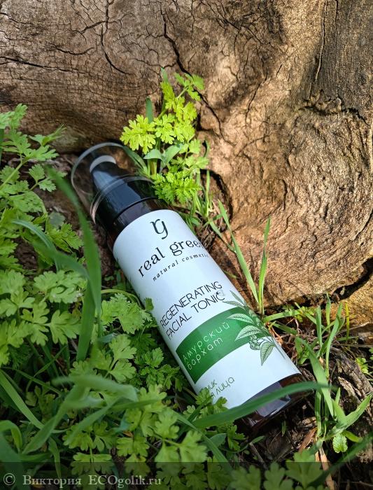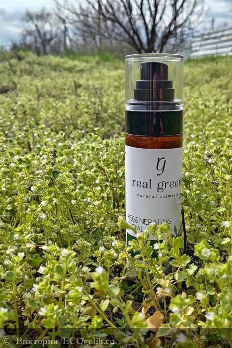 Название бренда Real Green выполнено в стильном шрифте, который гармонично сочетается с изображением зеленых листьев, символизирующих природу и заботу о коже. Это добавляет флакончику органичности и подчеркивает её натуральность.