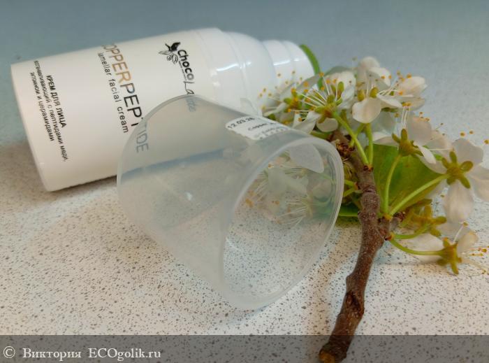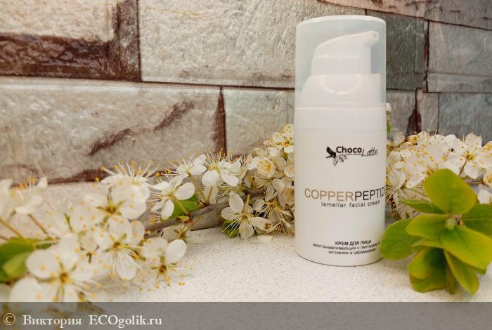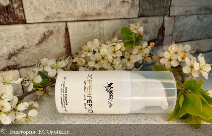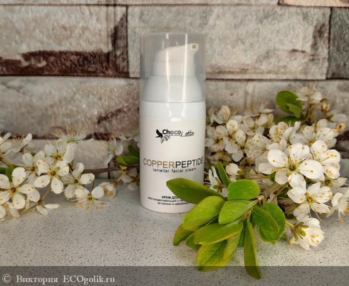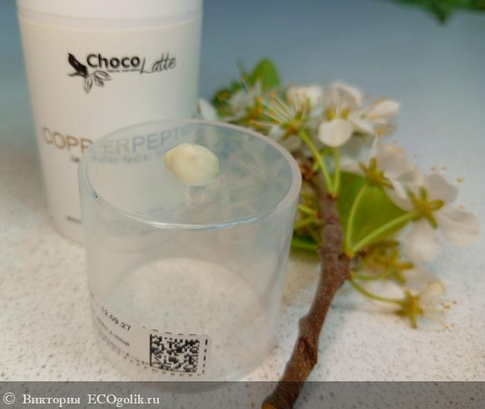 Кремушек представлен в минималистичном и элегантном дизайне, в пластиковом прочном флаконе. Его компактный флакон выполнен в белом цвете, что символизирует чистоту и свежесть. На передней стороне флакона размещено название бренда ChocoLatte, выполненное в изящном шрифте, а также название продукта CopperPeptide, написанное крупным и четким шрифтом. Это подчеркивает профессиональный подход к созданию продукта и его эффективность.