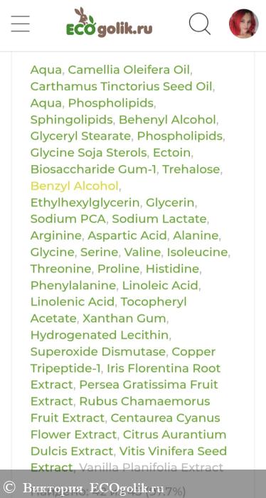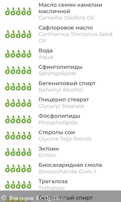 (INCI): Aqua, Camellia Oleifera (камелии) Oil, Carthamus Tinctorius Seed (сафлоровое) Oil, Aqua (and) Phospholipids (and) Sphingolipids, Behenyl Alcohol (and) Glyceryl Stearate (and) Phospholipids (and) Glycine Soja Sterols, Ectoin, Biosaccharide Gum-1, Trehalose, Benzyl Alcohol (and) Ethylhexylglycerin, Glycerin, Sodium PCA (and) Sodium Lactate (and) Arginine (and) Aspartic Acid (and) Alanine (and) Glycine (and) Serine (and) Valine (and) Isoleucine (and) Threonine (and) Proline (and) Histidine (and) Phenylalanine, Linoleic Acid (and) Linolenic Acid, Tocopheryl Acetate (витамин Е), Xanthan Gum, Hydrogenated Lecithin, Superoxide Dismutase, Copper Tripeptide-1 (2000 ppm), Iris Florentina Root (ириса) Extract, Persea Gratissima Fruit (авокадо) Extract, Rubus Chamaemorus Fruit (морошки) Extract, Centaurea Cyanus Flower (василька) Extract, Citrus Aurantium Dulcis (апельсина) Extract, Vitis Vinifera Seed (косточки винограда) Extract, Vanilla Planifolia (ванили) Extract