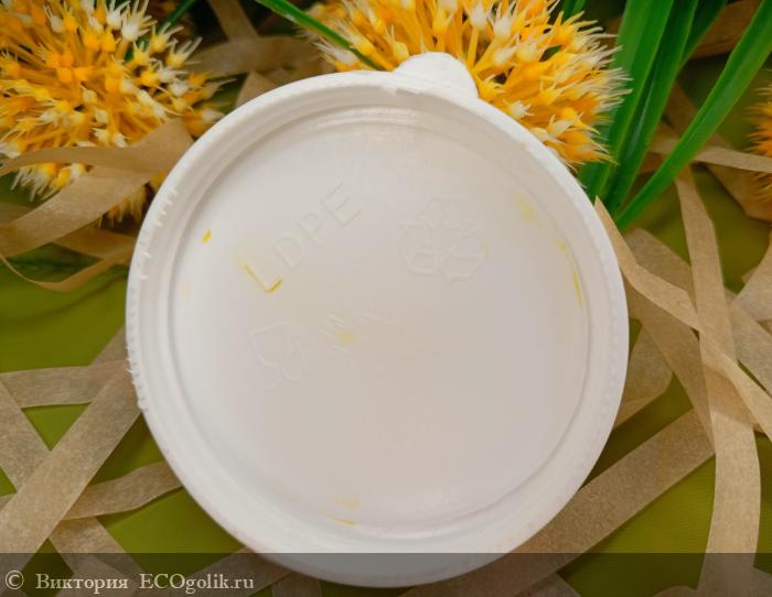 Дизайн баночки выглядит очень минималистично и стильно. Баночка с крышкой пластиковые, белого цвета. На баночке размещена наклейка, ее цвет нежный, мятно-зеленый, который ассоциируется с натуральностью и свежестью. Этот оттенок прекрасно подчеркивает экологичность продукта и его предназначение для ухода за кожей.
