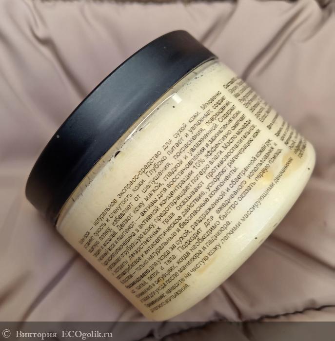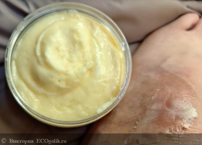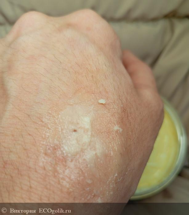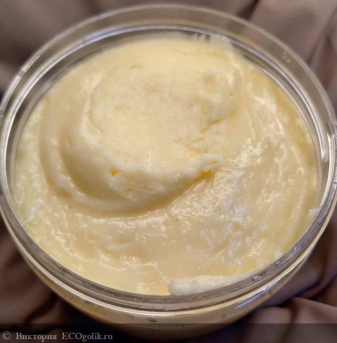 Консистенция густая, довольно плотная, но очень воздушная, пористая, нежная. При контакте с кожей очень быстро тает и хорошо впитывается, не оставляя жирных следов. Хотя текстура очень жирная.