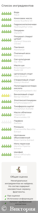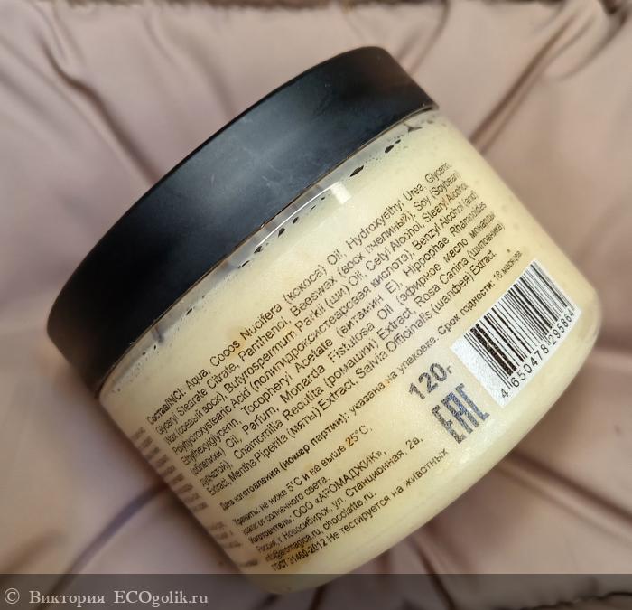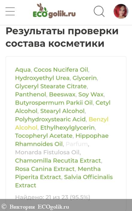 INCI: Aqua, Cocos Nucifera (кокоса) Oil, Hydroxyethyl Urea, Glycerin, Glyceryl Stearate Citrate, Panthenol, Beeswax (воск пчелиный), Soy (Soybean) Wax (соевый воск), Butyrospermum Parkii (ши) Oil, Cetyl Alcohol, Stearyl Alcohol, Polyhydroxystearic Acid (полигидроксистеаровая кислота), Benzyl Alcohol (and) Ethylhexylglycerin, Tocopheryl Acetate (витамин Е), Hippophae Rhamnoides (облепихи) Oil, Parfum, Monarda Fistulosa Oil (эфирное масло монарды дудчатой), Chamomilla Recutita (ромашки) Extract, Rosa Canina (шиповника) Extract, Mentha Piperita (мяты) Extract, Salvia Officinalis (шалфея) Extract.