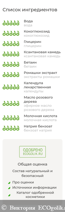 вода, кокоглюкозид, глицерин, ксантановая камедь, бетаин, экстракты ромашки и календулы, эфирное масло розового дерева, молочная кислота, бензоат натрия.
