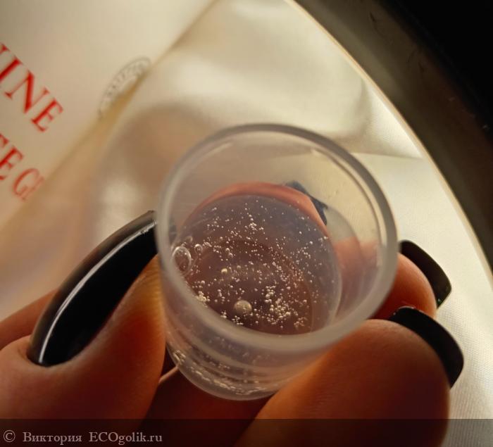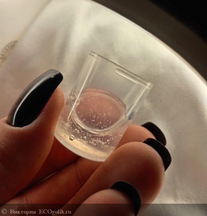 Прозрачная, слегка вязкая консистенция с маленькими пузырьками и шелковистой структурой плавно скользит по коже, образуя невесомую защитную плёнку. Её обволакивающая текстура дарит ощущение комфорта и свежести на долгое время.