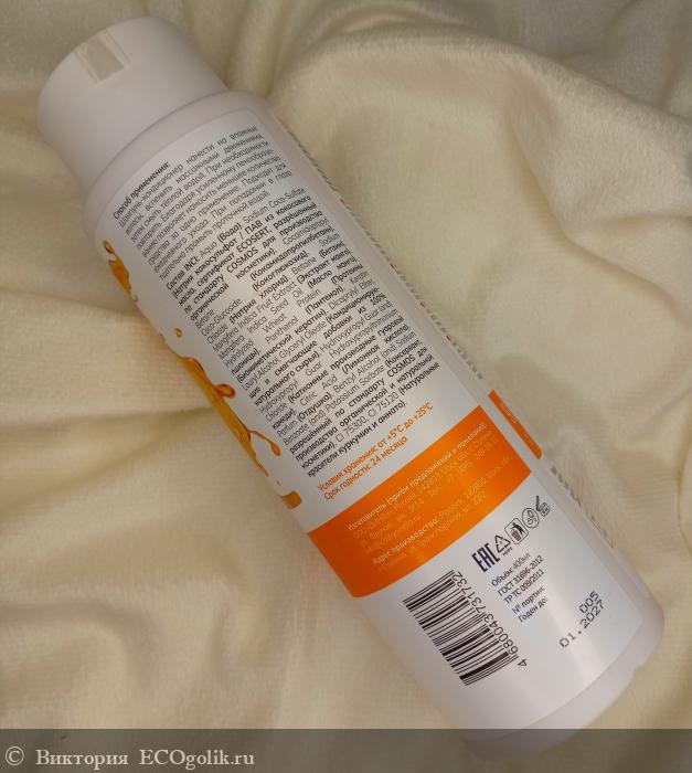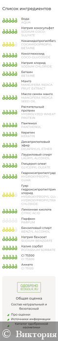 AQUA (ВОДА) • SODIUM COCO-SULFATE (НАТРИЯ КОКОСУЛЬФАТ / ПАВ ИЗ КОКОСОВОГО МАСЛА • СЕРТИФИКАТ ECOSERT, РАЗРЕШЕННЫЙ ПО СТАНДАРТУ COSMOS ДЛЯ ПРОИЗВОДСТВА ОРГАНИЧЕСКОЙ КОСМЕТИКИ) • COCAMIDOPROPYL BETAINE (КОКАМИДОПРОПИЛБЕТАИН) • COCO-GLUCOSIDE (КОКОГЛЮКОЗИД) • SODIUM CHLORIDE (НАТРИЯ ХЛОРИД) • BETAINE (БЕТАИН) • MANGIFERA INDICA FRUIT EXTRACT (ЭКСТРАКТ МАНГО) • MANGIFERA INDICA SEED OIL (МАСЛО МАНГО) • HYDROLYZED WHEAT PROTEIN (ПРОТЕИНЫ ПШЕНИЦЫ) • PANTHENOL (ПАНТЕНОЛ) • KERATIN (БИОМИМЕТИЧЕСКИЙ КЕРАТИН) • DICAPRYLYL ETHER (ДИКАПРИЛИЛОВЫЙ ЭФИР) • LAURYL ALCOHOL (ЛАУРИЛОВЫЙ СПИРТ) • GLYCERYL OLEATE (ГЛИЦЕРИЛ ОЛЕАТ) • HYDROXYPROPYL GUAR (AND) HYDROXYPROPYL GUAR HYDROXYPROPYLTRIMONIUM CHLORIDE (КАТИОННЫЕ ПРОИЗВОДНЫЕ ГУАРОВОЙ КАМЕДИ) • CITRIC ACID (ЛИМОННАЯ КИСЛОТА) • PARFUM (ОТДУШКА) • BENZYL ALCOHOL (AND) SODIUM BENZOATE (AND) POTASSIUM SORBATE (КОНСЕРВАНТ, РАЗРЕШЕННЫЙ ПО СТАНДАРТУ COSMOS ДЛЯ ПРОИЗВОДСТВА ОРГАНИЧЕСКОЙ И НАТУРАЛЬНОЙ КОСМЕТИКИ) • CI 75300 • CI 75120 (НАТУРАЛЬНЫЕ КРАСИТЕЛИ КУРКУМИН И АННАТО)