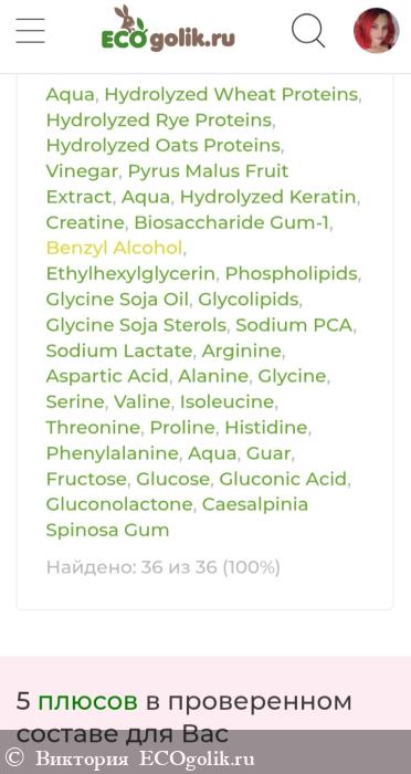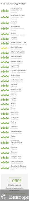 Aqua, Hydrolyzed Wheat Proteins (and) Hydrolyzed Rye Proteins (and) Hydrolyzed Oats Proteins, Vinegar (и) Pyrus Malus (Apple) Fruit Extract (and) Aqua, Hydrolyzed Keratin (and) Creatine, Biosaccharide Gum-1, Benzyl Alcohol (and) Ethylhexylglycerin, Phospholipids (and) Glycine Soja (Soybean) Oil (and) Glycolipids (and) Glycine Soja (Soybean) Sterols, Sodium PCA (and) Sodium Lactate (and) Arginine (and) Aspartic Acid (and) Alanine (and) Glycine (and) Serine (and) Valine (and) Isoleucine (and) Threonine (and) Proline (and) Histidine (and) Phenylalanine (and) Aqua, Guar, Fructose (and) Glucose (and) Gluconic Acid (and) Gluconolactone (and) Caesalpinia Spinosa Gum.