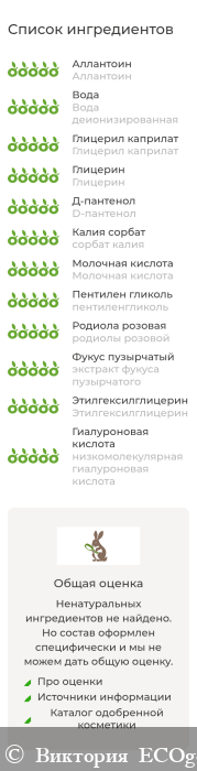 Состав: вода деионизированная, экстракт из листьев центеллы азиатской, глицерин, экстракт фукуса пузырчатого, D-пантенол, экстракт корня родиолы розовой, пирролидонкарбоксилат натрия (Na-PCA), пентиленгликоль, пальмитоилтрипептид-8 (Palmitoyl Tripeptide-8), низкомолекулярная гиалуроновая кислота, аллантоин, этилгексилглицерин, глицерил каприлат, молочная кислота (регулятор рН), сорбат калия.