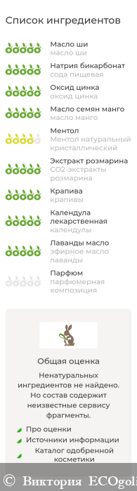 масло ши; маисовая пудра; сода пищевая; оксид цинка; масло манго; Ментол натуральный кристаллический; СО2-экстракты розмарина; крапивы и календулы; эфирное масло лаванды; парфюмерная композиция