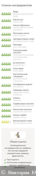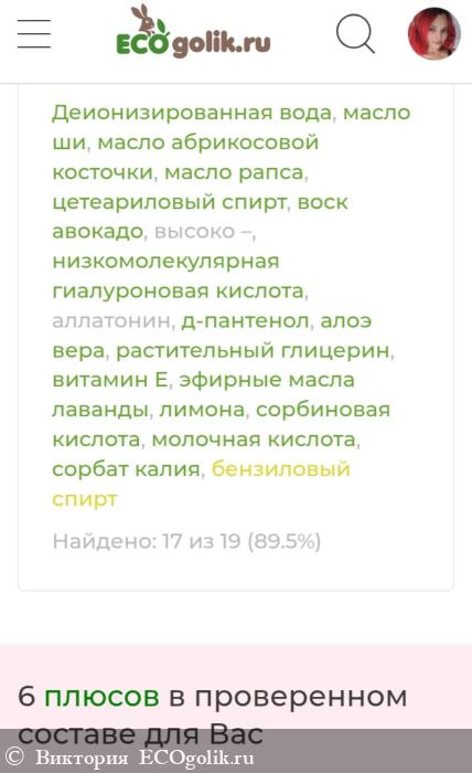 Деионизированная вода, масло ши, масло абрикосовой косточки, масло рапса, цетеариловый спирт, воск авокадо, высоко – и низкомолекулярная гиалуроновая кислота, аллатонин, д-пантенол (провитамин В5), алоэ вера, растительный глицерин, витамин Е, эфирные масла лаванды и лимона, сорбиновая кислота, молочная кислота, сорбат калия, бензиловый спирт