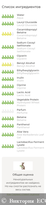 Aqua, Lauryl Glucoside, Cocamidopropyl Betaine, Sodium Cocoyl Isethionate, Glycerin, Benzyl Alcohol, Ethylhexylglycerin, Inulin, Sodium Сitrate, Glycine, Lactic Acid, Hydrolyzed Wheat Protein, Perfume, Betaine, Panthenol, Aloe Barbadensis (Aloe Vera) Leaf Gel, Lactobacillus Ferment Lysate, Chamomilla Recutita Flower Exctract.