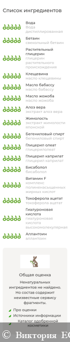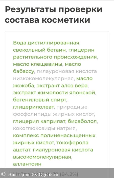 Вода дистиллированная, свекольный бетаин, глицерин растительного происхождения, масло клещевины, масло бабассу, гилауроновая кислота низкокомолекулярная, масло жожоба, экстракт алоэ вера, экстракт жимолости японской, бегениловый спирт, глицерилолеат, природные фосфолипиды жирных кислот, глицерил каприлат, бисаболол, кокоглюкозиды натрия, комплекс полиненасыщенных жирных кислот (витамин F), токоферола ацетат (витамин Е), гиалуроновая кислота высокомолекулярная, аллантоин.