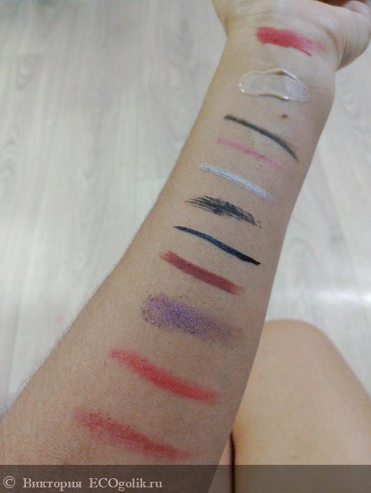 Так рука выглядит до использования мицеллярной воды, разный вид косметики.