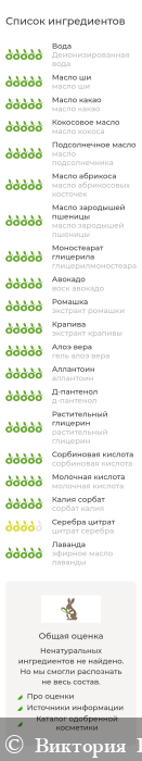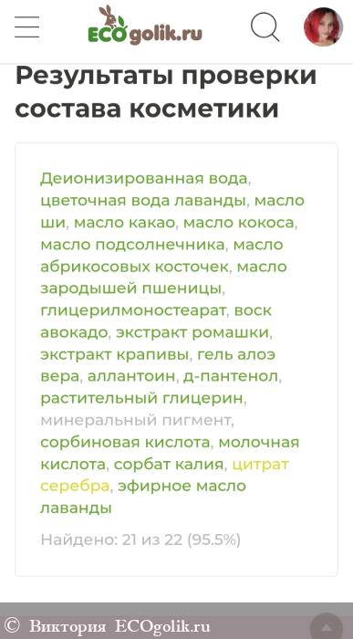 Деионизированная вода, цветочная вода лаванды, масло ши, масло какао, масло кокоса, масло подсолнечника, масло абрикосовых косточек, масло зародышей пшеницы, глицерилмоностеарат, воск авокадо, экстракт ромашки, экстракт крапивы, гель алоэ вера, аллантоин, д-пантенол (провитамин В5), растительный глицерин, минеральный пигмент, сорбиновая кислота, молочная кислота, сорбат калия, цитрат серебра, эфирное масло лаванды.