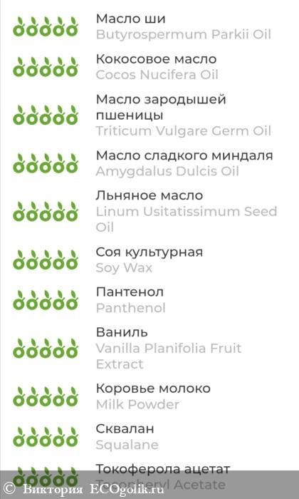 (INCI): Butyrospermum Parkii (ши) Oil, Cocos Nucifera (Coconut) (кокоса) Oil, Triticum Vulgare Germ (зародышей пшеницы) Oil, Amygdalus Dulcis (миндальное) Oil, Linum Usitatissimum Seed (льна) Oil, Soy (Soybean) Wax (воск сои), Panthenol, Vanilla Planifolia Fruit (ванили) Extract, Milk Powder, Squalane (сквалан), Tocopheryl Acetate (витамин E), Aloe Barbadensis Leaf (алоэ вера) Extract, Pyrus Malus (яблока) Extract, Vitis Vinifera (косточки винограда) Extract, Echinacea Purpurea (эхинацеи) Extract, Arctium Lappa (корня лопуха) Extract, Oryza Sativa (рисовой мучели) Extract, Citrus Limon (цедры лимона) Extract, Hedera Helix (плюща) Extract, Morus Alba (шелковицы) Extract.