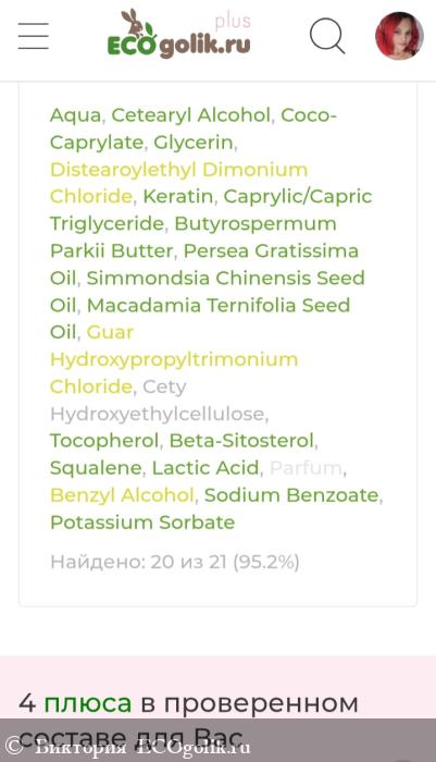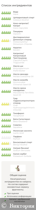 Aqua (Вода), Cetearyl Alcohol (Цетеариловый спирт / эмульгатор), Coco-Caprylate (Коко каприлат / эмолент) , Glycerin (Глицерин),Distearoylethyl Dimonium Chloride (Дистеароилэтил димониум хлорид / кондиционер), Keratin (Кератин), Caprylic/Capric Triglyceride (Каприлик/каприк триглицериды / эмолент), Butyrospermum Parkii Butter (Масло ши), Persea Gratissima Oil (Масло авокадо), Simmondsia Chinensis Seed Oil (Масло жожоба), Macadamia Ternifolia Seed Oil (Масло макадамии), Guar Hydroxypropyltrimonium Chloride (Гуар гидроксипропилтримония хлорид / кондиционер), Cety Hydroxyethylcellulose (Цетил гидроксиэтилцеллюлоза / целлюлозный загуститель), Tocopherol, Beta-Sitosterol, Squalene (Токоферол, Бета- ситостерол, Сквален / природный антиоксидант), Lactic Acid (Молочная кислота), Parfum (Отдушка), Benzyl Alcohol, Sodium Benzoate, Potassium Sorbate (Бензиловый спирт, Бензоат натрия, Сорбат калия / консервант, разрешенный по стандарту COSMOS для производства органической косметики).