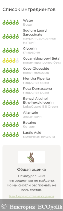 Вода, лаурил саркозинат натрия, глицерин, кокамидопропилбетаин, коко-глюкозид, натуральный увлажняющий фактор, гидролат мяты, гидролат розы, LekoGuard EB Green, гидрованс, аллантоин, бетаин, экстракт гинго-билоба, экстракт хурмы, молочная кислота.