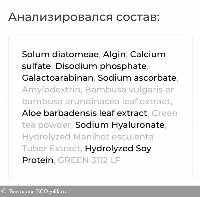 Состав: Solum diatomeae, Algin, Calcium sulfate, Disodium phosphate, Galactoarabinan, Sodium ascorbate, Amylodextrin, Bambusa vulgaris or bambusa arundinacea leaf extract, Aloe barbadensis leaf extract, Green tea powder, Sodium Hyaluronate, Hydrolyzed Manihot esculenta Tuber Extract, Hydrolyzed Soy Protein, GREEN 3112 LF.