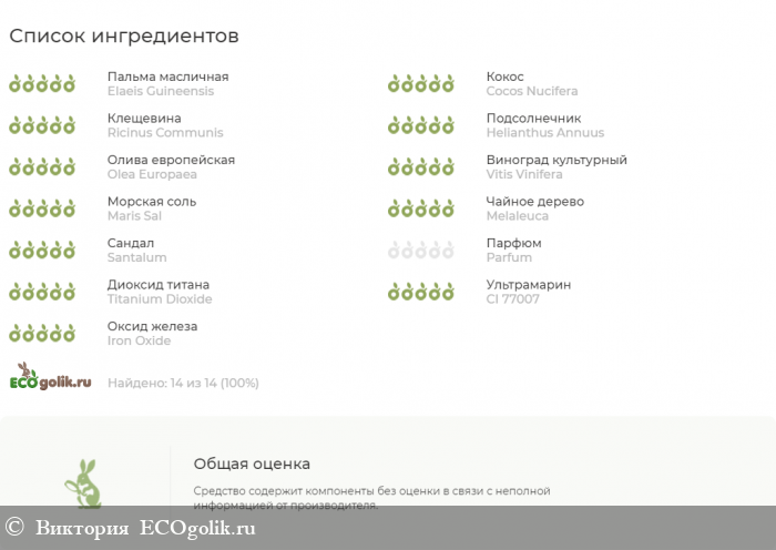 Состав мыла: омыленные масла: пальмовое, кокосовое, оливковое, касторовое, подсолнечное, оливковое масло, масло виноградной косточки, соль морская, эфирное масло чайного дерева, эфирное масло сандала, парфюмерная композиция, CI 77891, CI 77007, CI 77492 (натуральные красители).