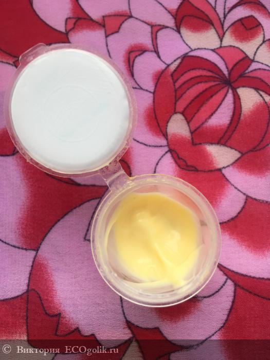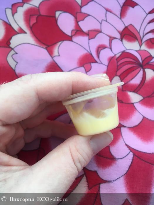 Открывая крышечку контейнера, я увидела красивый жёлтенький крем. У него гладкая консистенция и глянцевый отблеск.