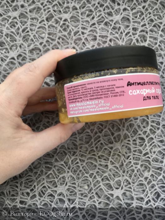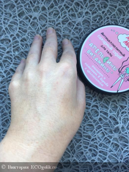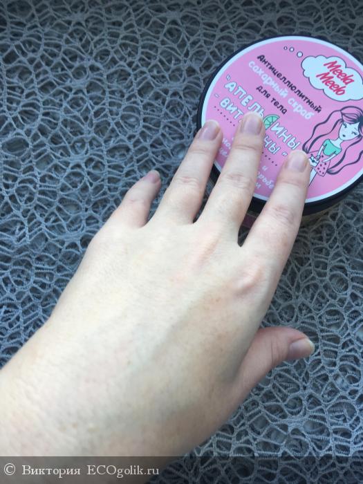 Когда писала отзыв, заметила, что этим скрабом мне комфортно пользоваться даже для рук. Я считаю, что именно благодаря размеру крупинок сахара и тому, что они быстро тают.