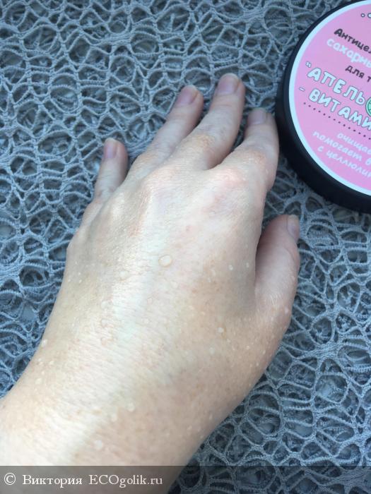 Но фото можно увидеть, что скраб оставляет на коже масла: вода при смывании собирается в капельки, а вот потом кожа становится умасленной и холёной, ухоженной.