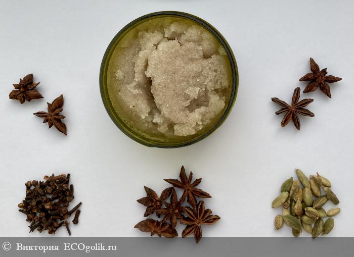 Если обратить внимание на состав скраба, то он изготовлен на смеси сахара с морской солью. Ранее таких вариантов у меня не было. Обычно мне попадались скрабы для тела либо на сахаре, либо на соли, лишь однажды я пользовалась смесовым вариантом из кофе и соли. Сахарно-солевая основа пропитана целым комплексом масел: здесь и масло оливковое, и кокосовое, и ши, и клещевины, и миндальных косточек. Ну и конечно же экстракты, пряности, эфирные масла, благодаря которым у скраба тёплый и насыщенный аромат пряностей.