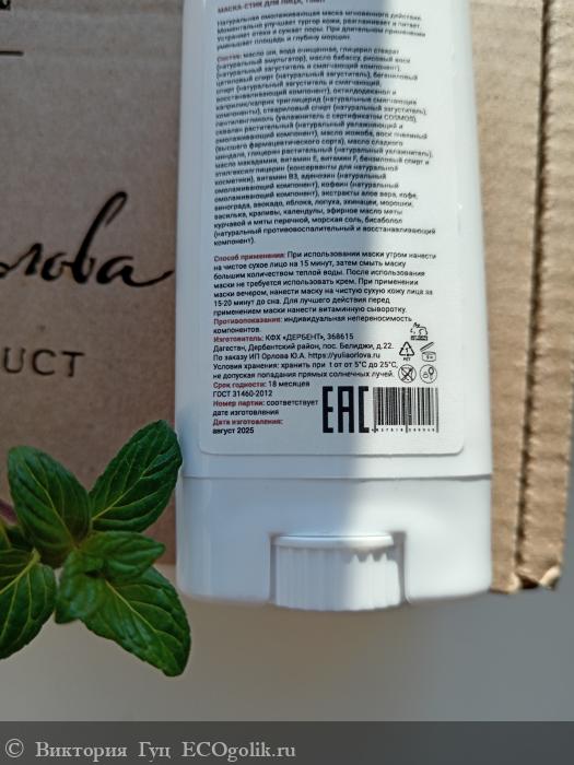 Мне нравится маска от Юлии Орловой, она работает! Единственным минусом я могу назвать лишь то, что маску тяжело смывать с поверхности кожи, а можно использовать на ночь и не смывать вообще😉. Удобная и практичная вещь в моей косметичке🤗.