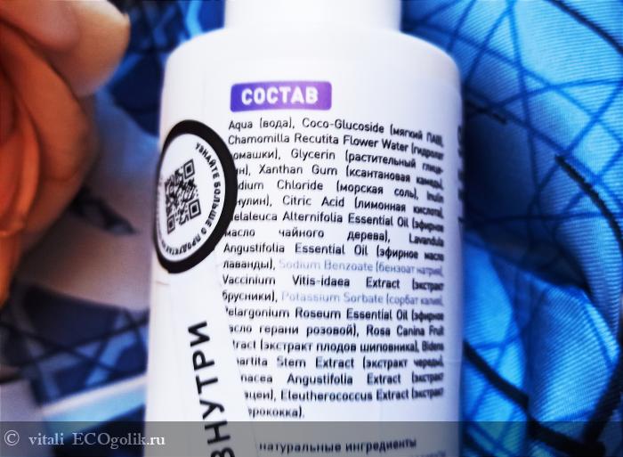 Aqua (вода), Coco-Glucoside (мягкий ПАВ), Chamomilla Recutita Flower Water (гидролат ромашки), Glycerin (растительный глицерин), Xanthan Gum (ксантановая камедь), Sodium Chloride (морская соль), Inulin (инулин), Citric Acid (лимонная кислота), Melaleuca Alternifolia Essential Oil (эфирное масло чайного дерева), Lavandula Angustifolia Essential Oil (эфирное масло лаванды), Sodium Benzoate (бензоат натрия), Vaccinium Vitis-idaea Extract (экстракт брусники), Potassium Sorbate (сорбат калия), Pelargonium Roseum Essential Oil (эфирное масло герани розовой), Rosa Canina Fruit Extract (экстракт плодов шиповника), Bidens Tripartita Stem Extract (экстракт череды), Echinacea Angustifolia Extract (экстракт эхинацеи), Eleutherococcus Extract (экстракт элеутерококка).