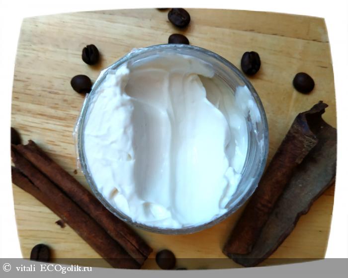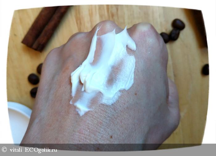 Крем имеет плотную консистенцию. При этом он легко распределяется и очень быстро впитывается. Цвет чисто белый. Аромат очень приятный, чувствуются нотки ванили, корицы и немного кофе (хотя кофе в составе нет).