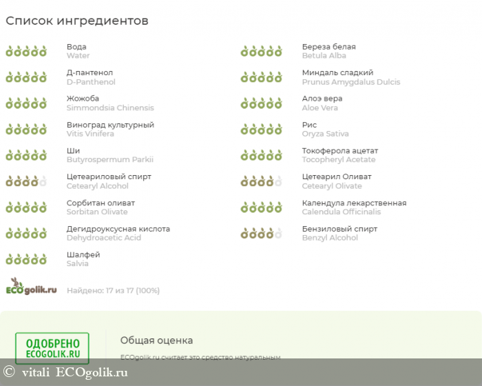 Вода, гидролат березы, Д-пантенол, масло миндаля, масло жожоба, гель алоэ вера, масло виноградной косточки, масло рисовых отрубей, масло ши, витамин Е, цетилстеариловый спирт, цетеарил оливат, сорбитан оливат (растительные эмульгаторы), экстракт календулы, дегидроуксусная кислота, бензиловый спирт (растительные консерванты), эфирное масло шалфея.