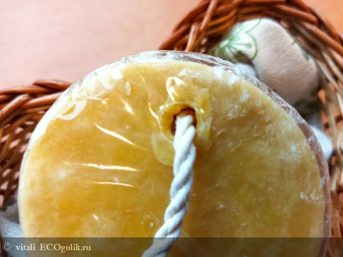 Мыло яркое и позитивное, в виде шайбы, напоминает мне солнышко! Оно запечатано прозрачной пленкой, которая служит упаковкой и защищает его. В мыле продет шнурок, за который удобно подвешивать мыло в ванной комнате.