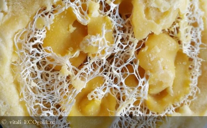 С одной стороны мыло гладкое, с другой явно выделяется люфа. Люфа - это растение рода травянистых лиан из семейства тыквенных. Эко-мочалки и производят из люфы!