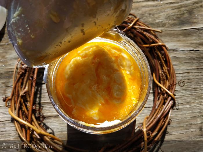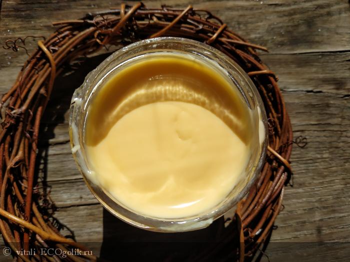 , крем у меня свежий, хранить его можно достаточно долго, но он стал расслаиваться. Вот такой крем я увидела под фольгой при первом вскрытии.