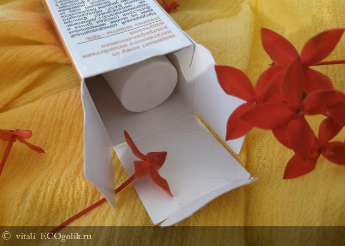 Такой формат упаковки мне очень понравился. Картонную упаковку я сразу убрала. Тюбик, с одной стороны, мал, а с другой - для лица его более чем достаточно! Легкий и маленький он помещается и в сумочку, и в карман шорт! Крышка надежно защищает крем от протекания.