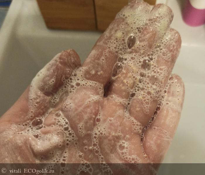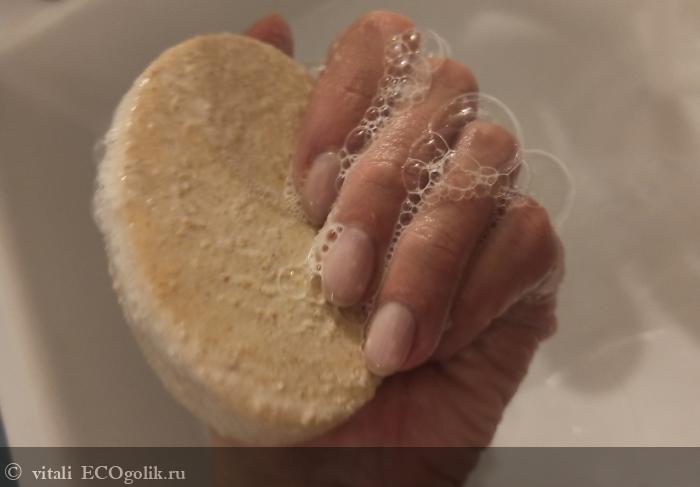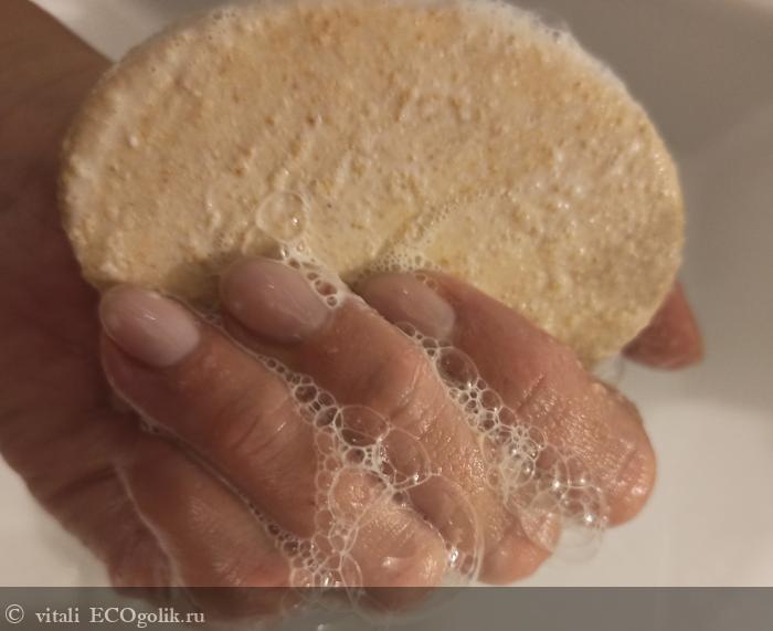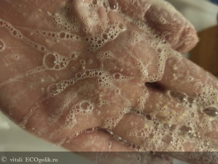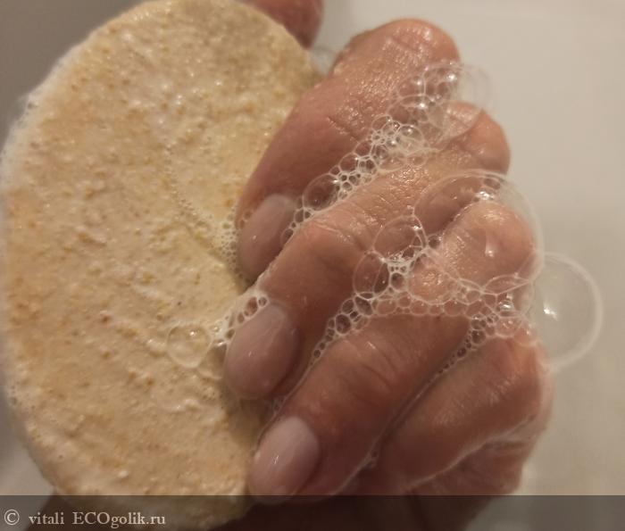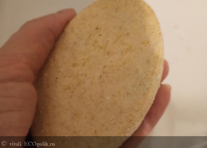 Скраб выполнен в виде кусочка мыла и отлично помещается в ладонь. Он великолепно пенится, благодаря натуральным ПАВ в составе, и может использоваться вместо мыла или крем-мыла.