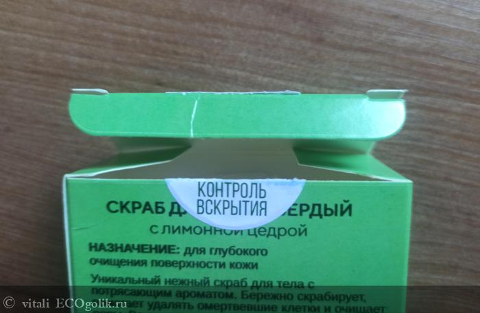Сам Скраб - твердого формата, напоминает мыло. Он упакован в оберточную бумагу, которая обеспечивает дополнительную защиту.