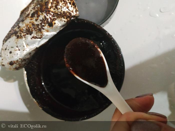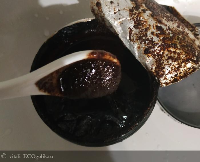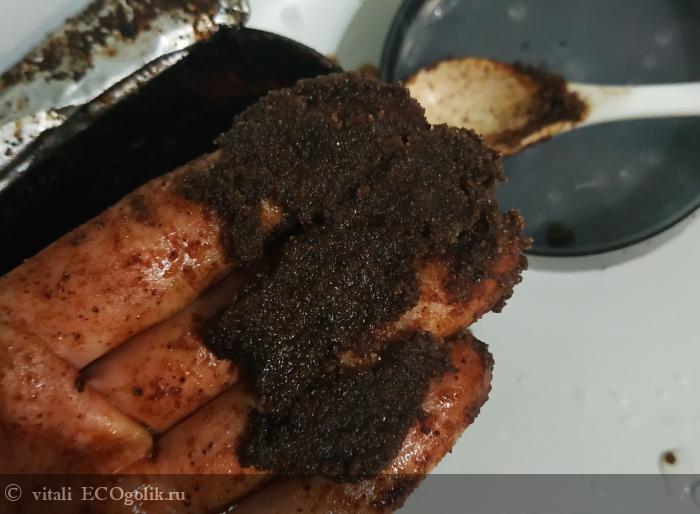 Скраб, как я уже сказала, имеет яркий кофейно-шоколадный аромат. Цвет - кофейный. Консистенция в начале при вскрытии банки была жидкая, кофе осел на дно. Но после того, как я размешала скраб, он приобрел однородную, достаточно плотную консистенцию.