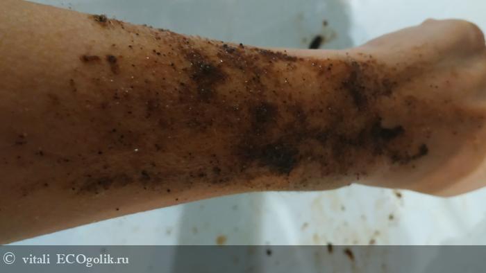 Скраб приятный в использовании, мягко скрабирует тело, увлажняет его и питает. При нанесении скраб немного окрашивает кожу и стены душевой кабинки, но краска легко смывается водой. В целом, скраб мне понравился, он действительно хорош, но не за такую завышенную цену.