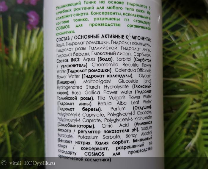 Aqua (Вода), Sorbitol (Сорбитол / увлажнитель), Chamomilla Recutita Flower Water (Гидролат ромашки), Calendula Officinalis Flower Water (Гидролат календулы), Glycerin (Глицерин), Maltooligosyl Glucoside (and) Hydrogenated Starch Hydrolysate (Глюкозный сироп), Rosa Gallica Flower Water (Гидролат Галлийской розы), Tilia Vulgaris Flower Water (Гидролат липы), Betula Alba Leaf Water (Гидролат березы), Parfum (Отдушка), Polyglyceryl-6 Caprylate, Polyglyceryl-3 Cocoate, Polyglyceryl-4 Caprate, Polyglyceryl-6 Ricinoleate (Соллюбилизаторы), Citric Acid (Лимонная кислота / регулятор показателя pH), Sodium Benzoate, Potassium Sorbate, Benzyl Alcohol (Бензоат натрия, Калия сорбат, Бензиловый спирт / консервант, разрешенный по стандарту COSMOS для производства органической косметики).