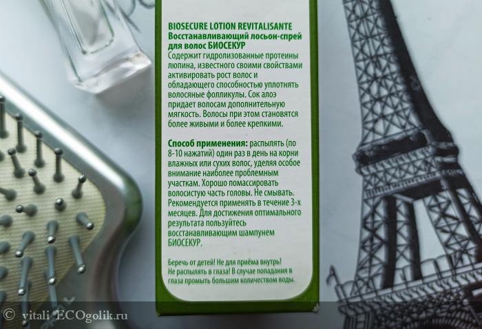 - эффекта ноль! Рекомендуется все-таки 3 месяца ежедневного применения для достижения результата! К тому же 8-10 пшиков, как по мне, так этого явно маловато для проявления эффекта. - Ко всему, хочется это средство сравнить с двумя средствами других брендов. Биотоник для роста волос от Chocollate - стоит дешевле в 3 раза, объем в 3 раза больше и волосы от него не грязнятся. Второе средство Тоник для волос Травяной от Шоненбергера, стоит он 2 000 руб. за 200 мл., что в пересчете на 30 мл будет стоит 300 р, и волосы после него не теряют свою чистоту. Несмотря на то, что в его составе на первом месте числится спирт, в целом состав будет богаче, чем у лосьона-спрея БИОСЕКУР.