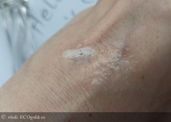 Пенистая жидкость с легким сладким травяным ароматом. Аромат совсем ненавязчивый, моментально выветривается с кожи и волос. При распределении по коже лосьон быстро впитывается, не оставляя никаких следов (нет жирности, скольжения или стягивания)! На волосах впитывает чуть подольше.