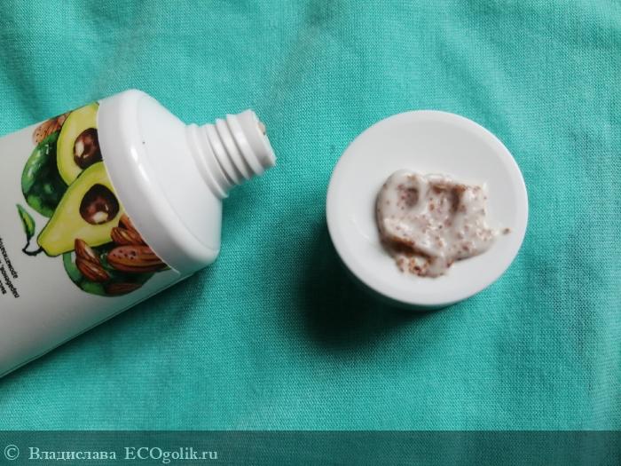 Скраб приятно пахнет лимончиком и сосной. В нем измельченные миндальные косточки, масла ши, авокадо, какао (то есть пока обрабатываете кожу, он ее питает), эфирные масла сосны, бея, лемонграсса (для освежения кожи стоп, для профилактики проблем кожных с ней, для аромата).