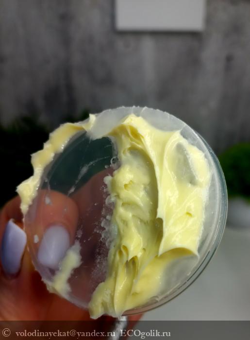 Внутри баночки есть пластиковый ограничитель , что довольно предусмотрительно во избежании протечек. Сама маска без какого либо яркого запаха, но имеет сливочный оттенок, будто туда куркумы бахнули.