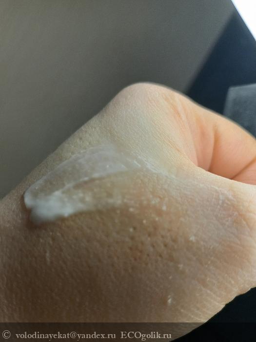 Внутри продукт кремовой текстуры и на первый взгляд абсолютно не понятно как это средство будет работать. Однако при нанесении на кожу в этом креме чувствуются настолько мелкие частицы , что вооружённым взглядом их не увидеть.